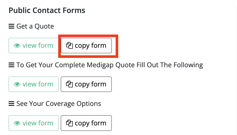 From the “Public Contact Forms” column, find the contact form that you’d like to copy and edit. Click the Copy Form button below your selected form.