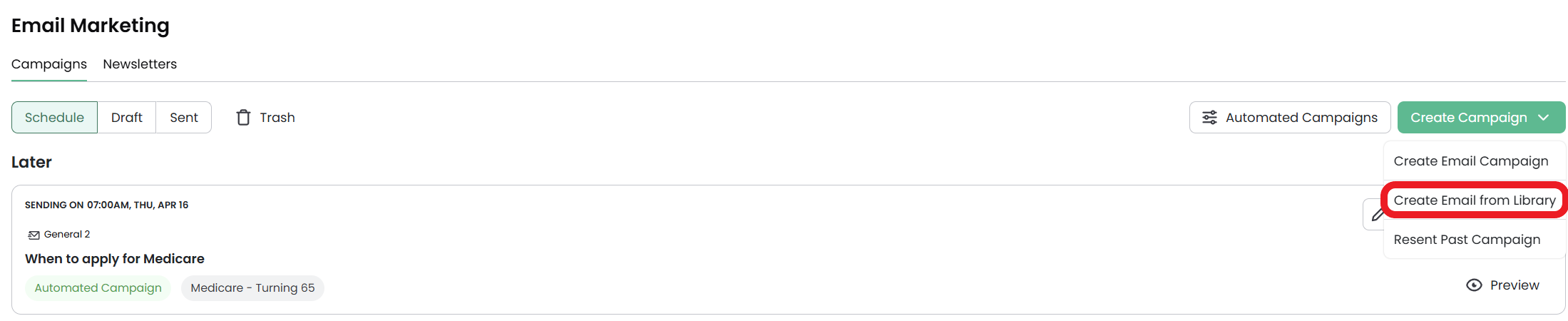 To start adding a new email, click the Create Campaign button and select Create Email from Library from the main Email Marketing page.