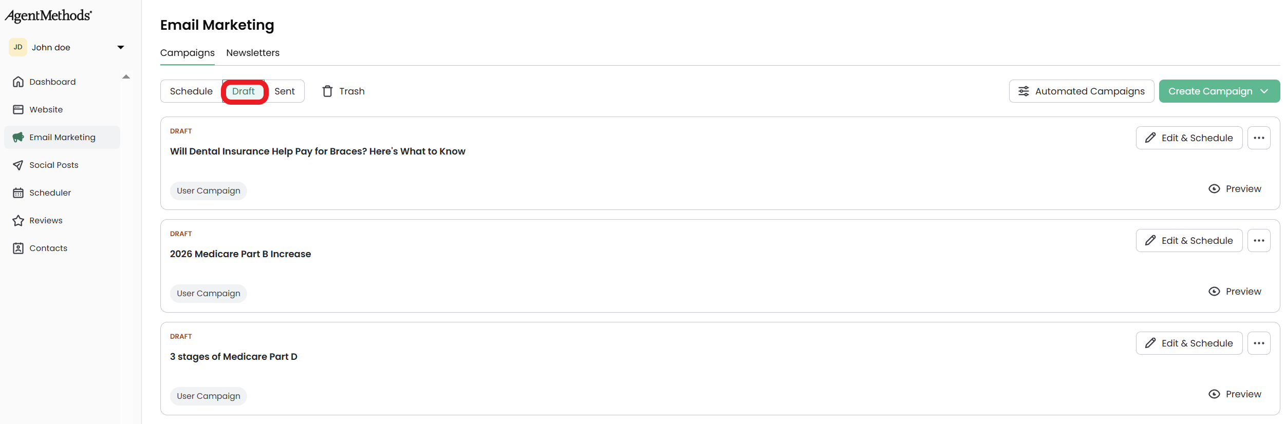 You'll be redirected to the email campaign library. These are emails that are created by the AgentMethods team and are ready to send!