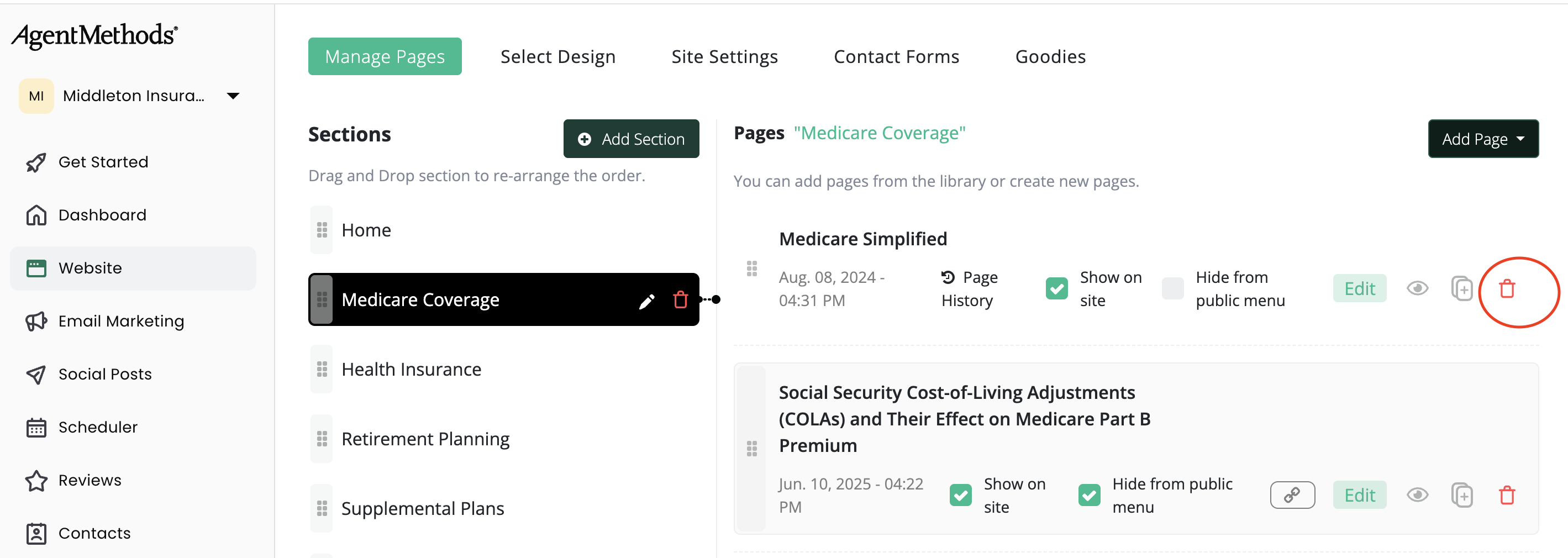 Your website is made up of pages organized into sections, such as your homepage, about page, or product pages. This guide will show you how to add new pages from the library, remove pages you do not need, and reorder pages within a section.