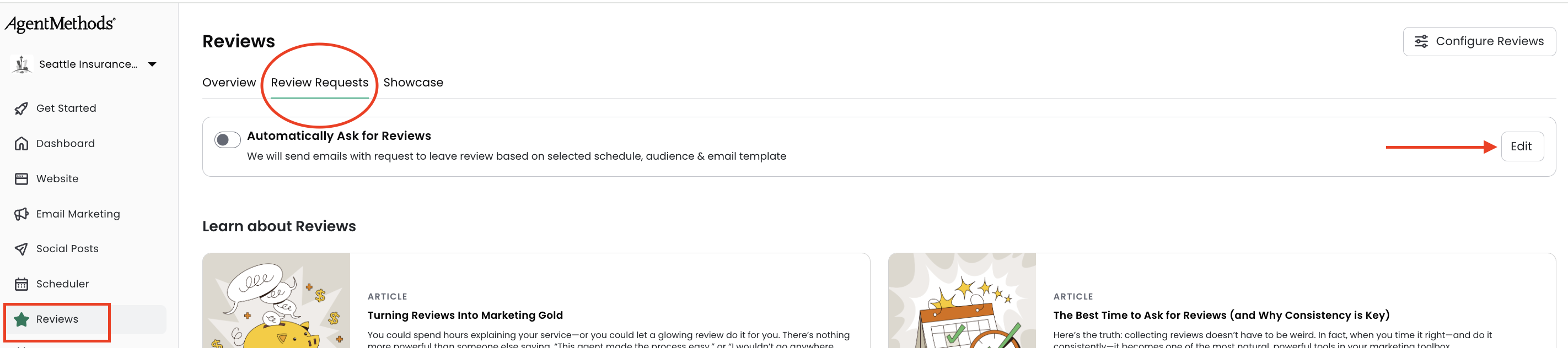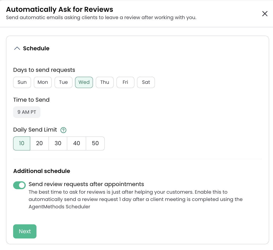 If you are using the AgentMethods scheduling calendar, you can also enable the option to automatically send a review request to anyone who schedules an appointment. When this option is turned on, the review request email will be sent the day after the appointment.