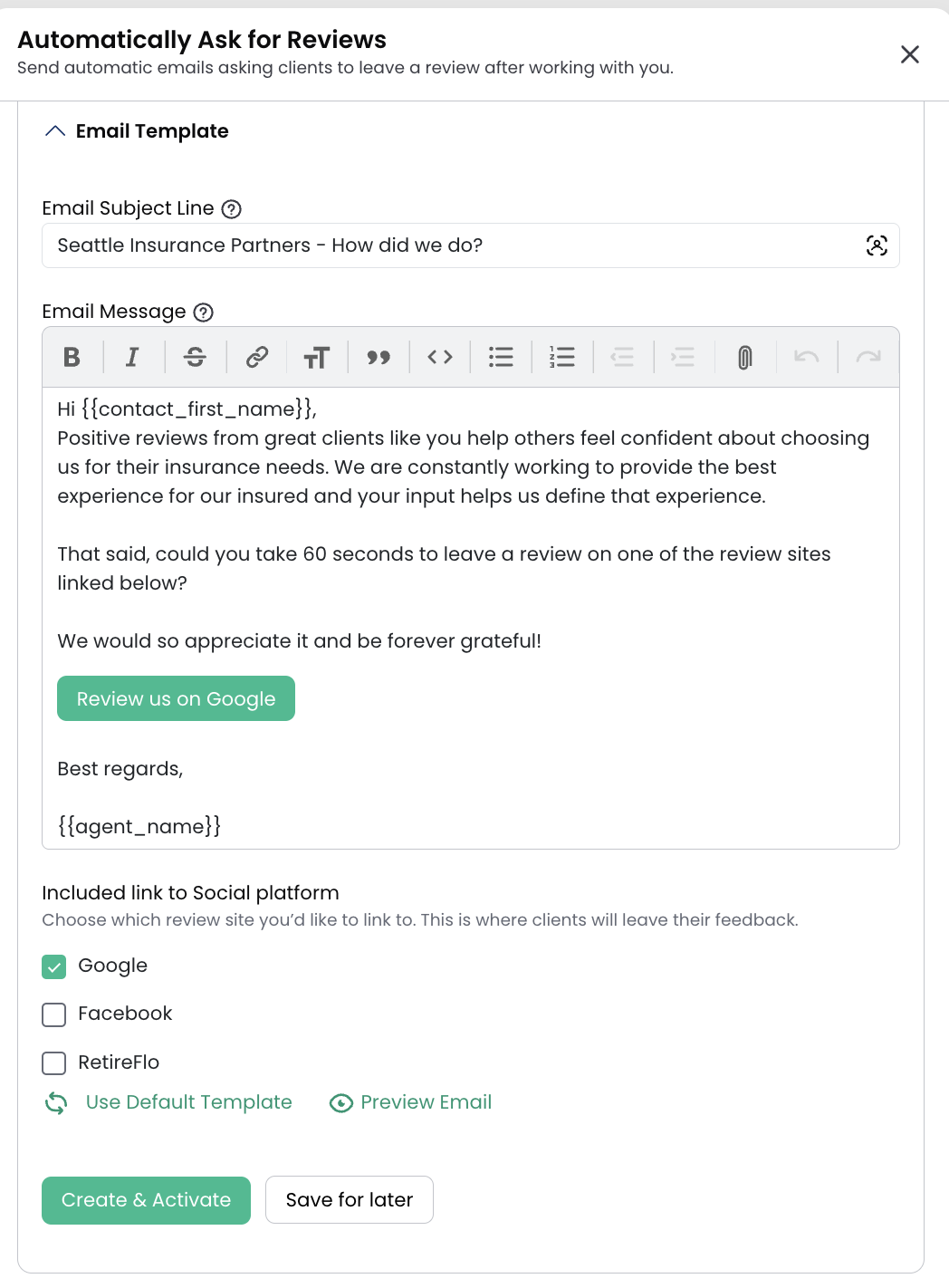 When everything looks correct, click Create & Activate to start your review request campaign.