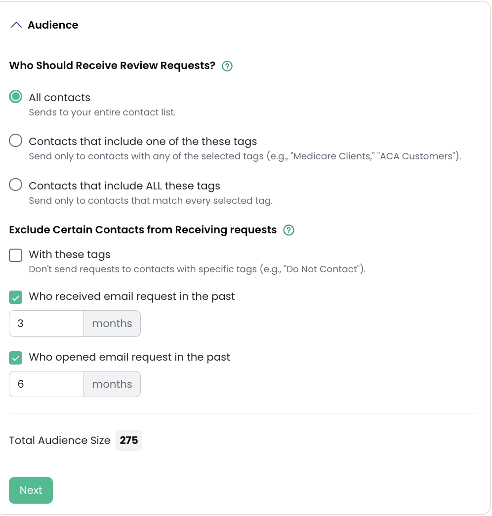 You can also exclude contacts based on tags or prevent contacts from receiving review requests too frequently by excluding those who received a request recently.