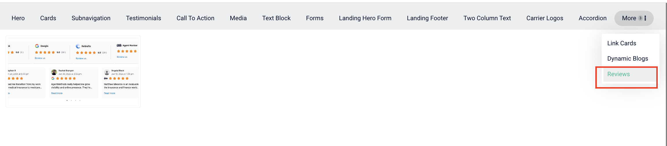 Once added, the Reviews component will automatically display any reviews you have selected to showcase.