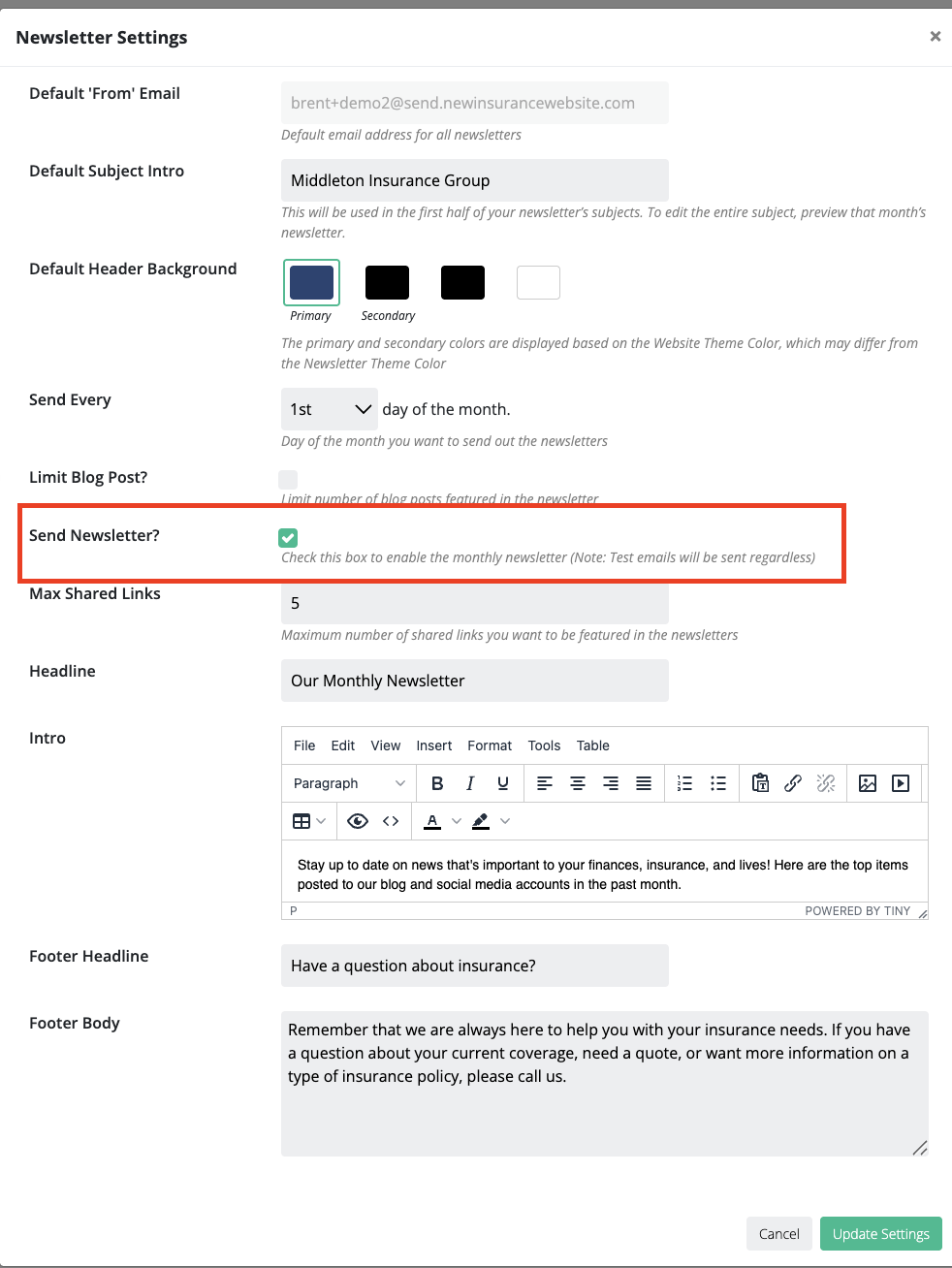- Send Newsletter? – enable this option to turn on the monthly newsletter